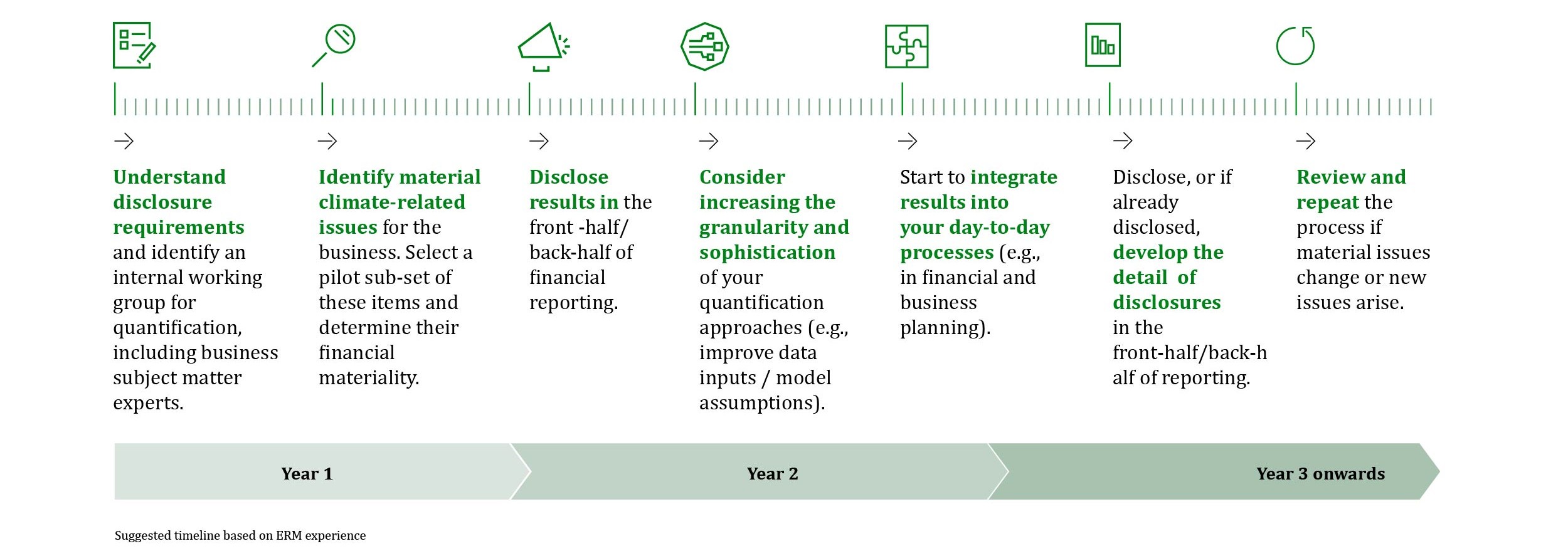 As the key consideration points outlined above show, it is important to consider the financial quantification process in a holistic sense, and although requirements to quantify and disclose climate-related issues are fast emerging, meeting these should be seen as an iterative process rather than a one-off event. To ensure success, organizations should spend sufficient time structuring their efforts, engaging stakeholders across a variety of teams, and gathering the key data and information required. Developing a realistic roadmap to quantifying and integrating material issues into financial reporting can help to guide these efforts. Like the implementation of the TCFD recommendations, it may take more than one reporting cycle for climate-related integration to meet the standard expected by investors and other stakeholders. A typical timeline of suggested steps for successful financial quantification is presented in the figure below: