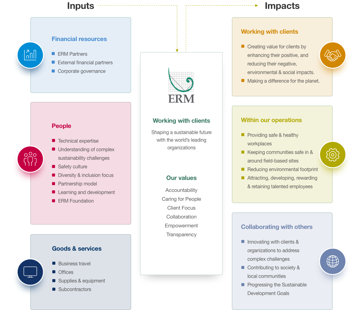 ERM’s sustainability context is driven by our value chain. We are a group of experienced professionals with outstanding technical expertise and business acumen from across the world. As an organization with a clear purpose and strong values ERM deploys this experience and expertise to deliver impact through the work with our clients, through collaborating with others and through improving our own operations.