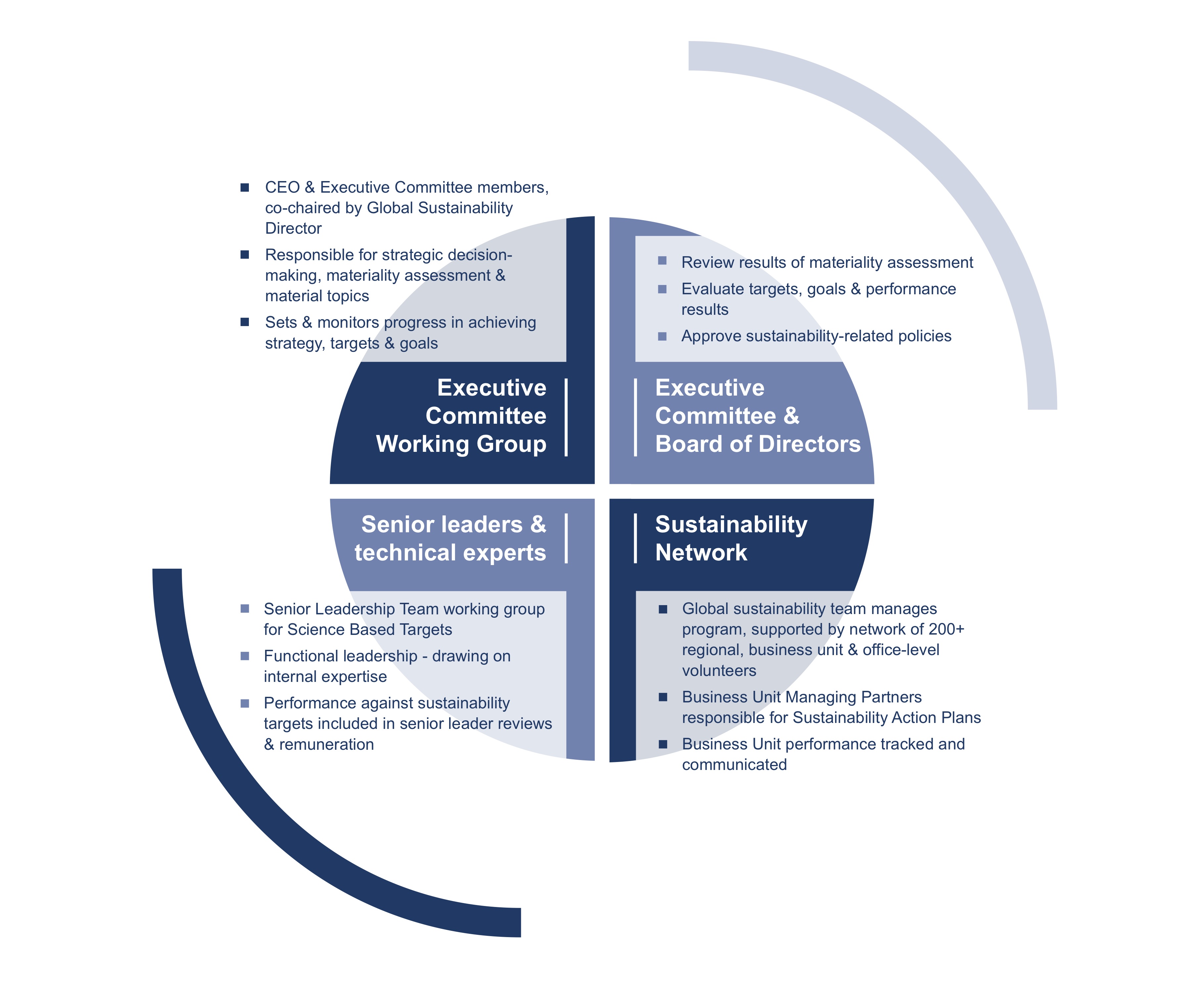 A working group of ERM’s Executive Committee provides strategic leadership on sustainability and reports via the CEO to ERM's Board of Directors.
