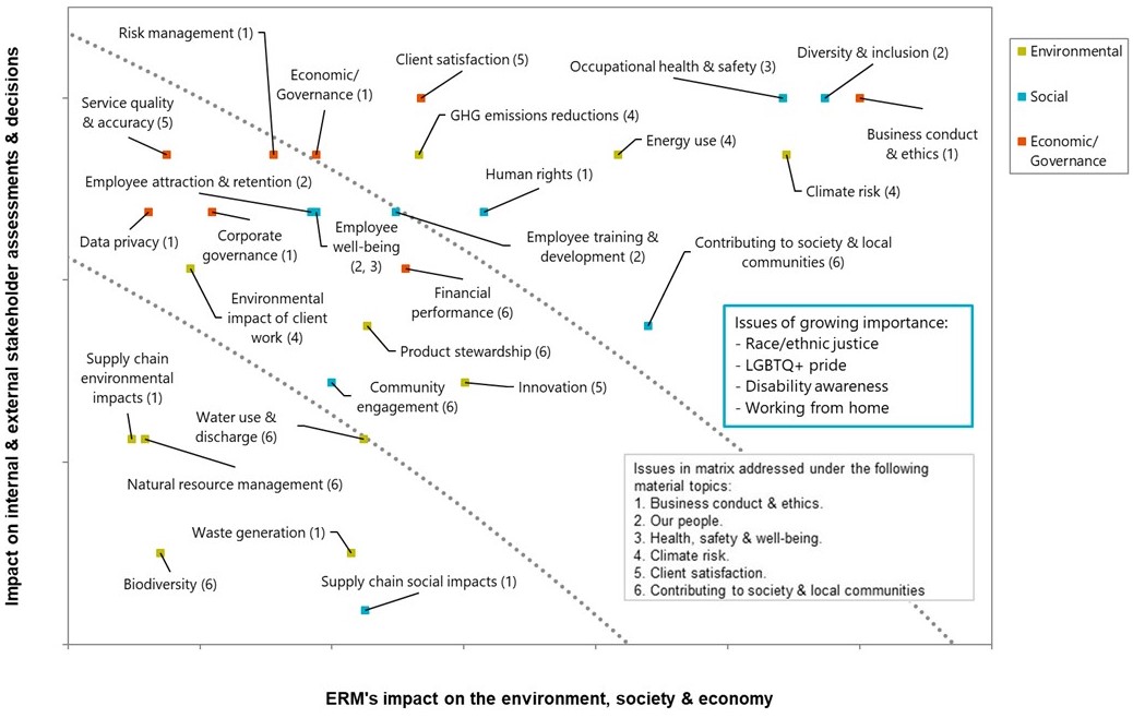 - Consequences for ERM that are related to our impacts on the economy, the environment, and society. For each of the material topics, ERM defined the boundary of impact, and its relationship to the GRI Standards and ERM’s strategic business drivers (see below).
